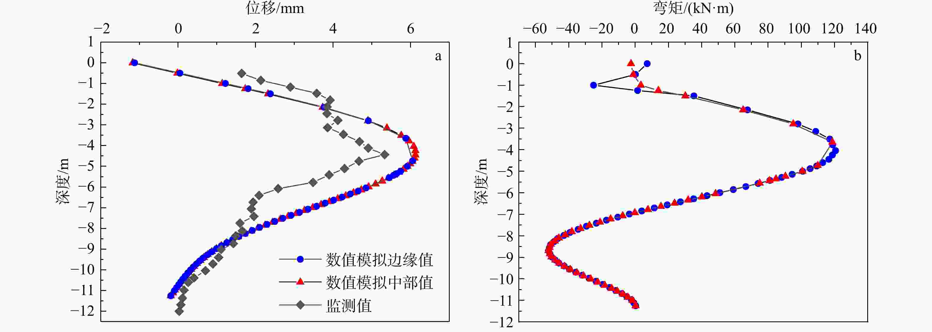 土层 杂填土 素填土 互层土 粉砂 粉细砂 z/m 1.5 2.8 11.7 20 51.8 γ/(kN·m−3) 18.5 18.2 18.2 18.6 18.8 γsat/(kN·m−3) 19 18.7 18.7 19.1 19.3 $E_{50}^{\mathrm{ref}} $/MPa 6.346 5.389 7.5 18.0 28.0 $E_{{\mathrm{oed}}}^{\mathrm{ref}} $/MPa 6.346 5.389 7.5 18.0 28.0 $E_{{\mathrm{ur}}}^{\mathrm{ref}} $/MPa 19.04 16.17 22.5 54.0 84.0 $G_{0}^{\mathrm{ref}} $/MPa 7.933 6.737 62.4 70.94 70.94 γ0.7 7.51×10−4 1.07×10−3 1.80×10−4 4.20×10−4 1.00×10−3 c/kPa 10 12 5 0 0 φ/(°) 18 10 15 33 31 ψ/(°) 0 0 0 3 1 注:z. 土层底面埋深;γ. 天然重度;γsat. 饱和重度;$E_{50}^{{\mathrm{ref}}} $. 参考割线刚度;$E_{{\mathrm{oed}}}^{{\mathrm{ref}}} $. 参考压缩模量;$E_{{\mathrm{ur}}}^{{\mathrm{ref}}} $. 参考卸载-再加载模量;$G_{0}^{{\mathrm{ref}}} $. 参考初始剪切模量;γ0.7. 阈值剪应变;c. 黏聚力;φ. 内摩擦角;ψ. 剪胀角 表 2 支护结构物理力学参数