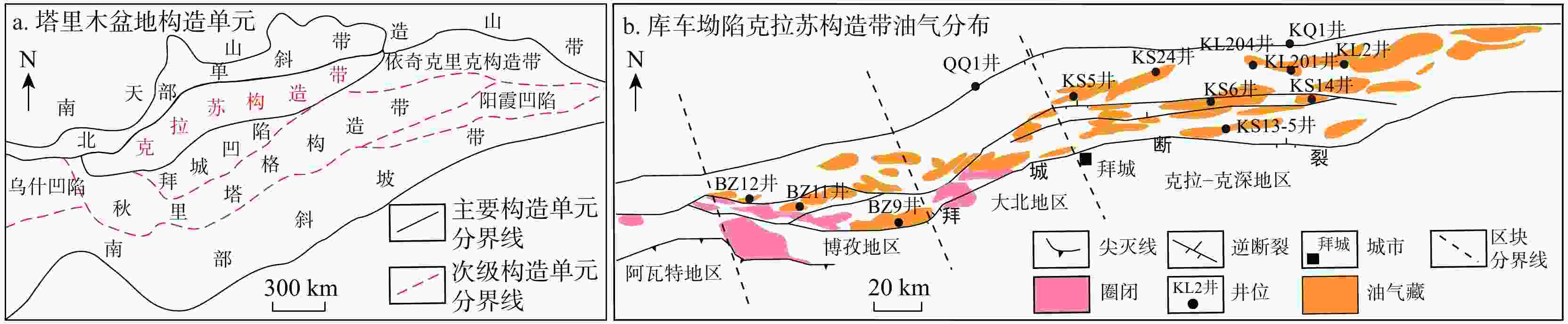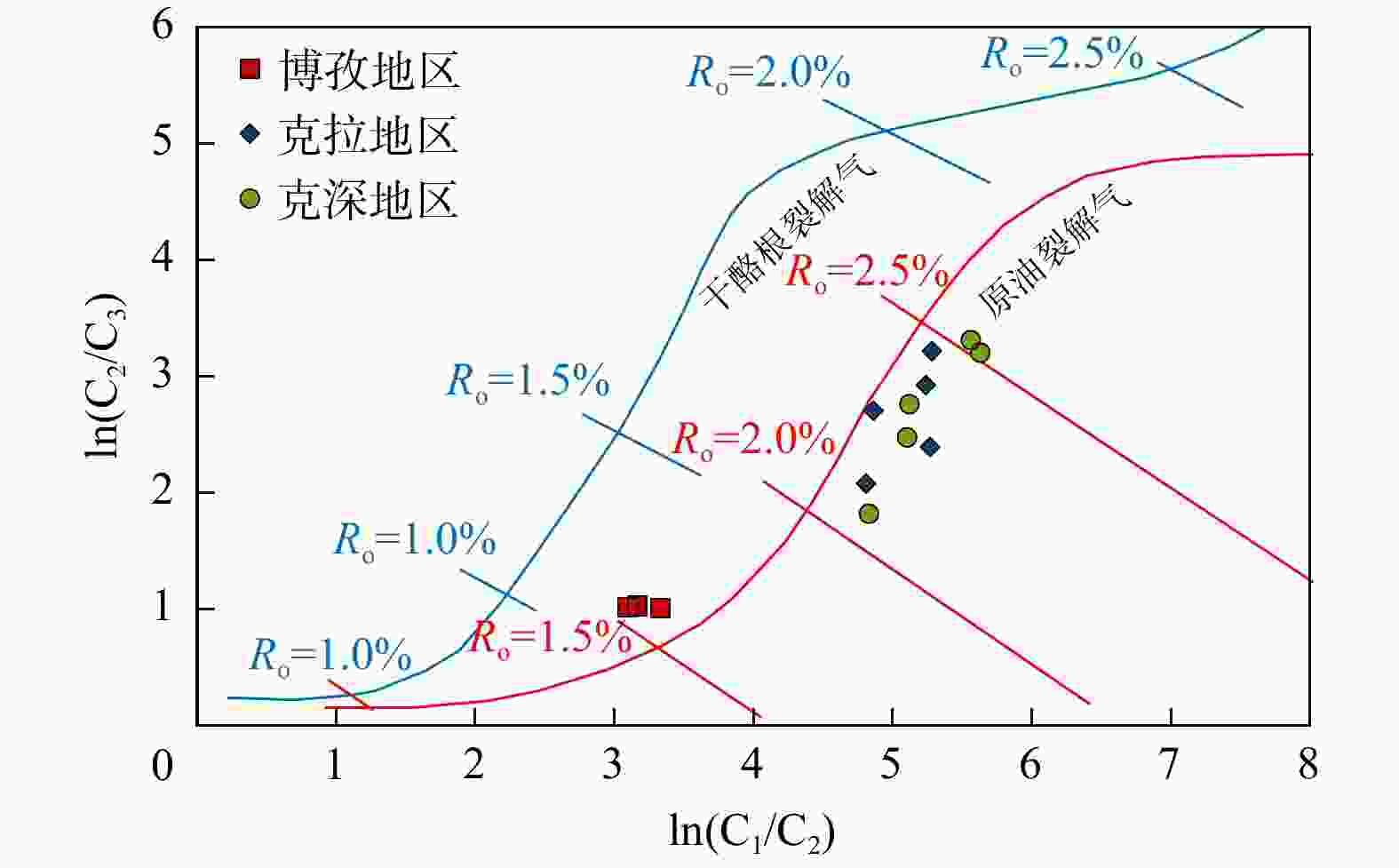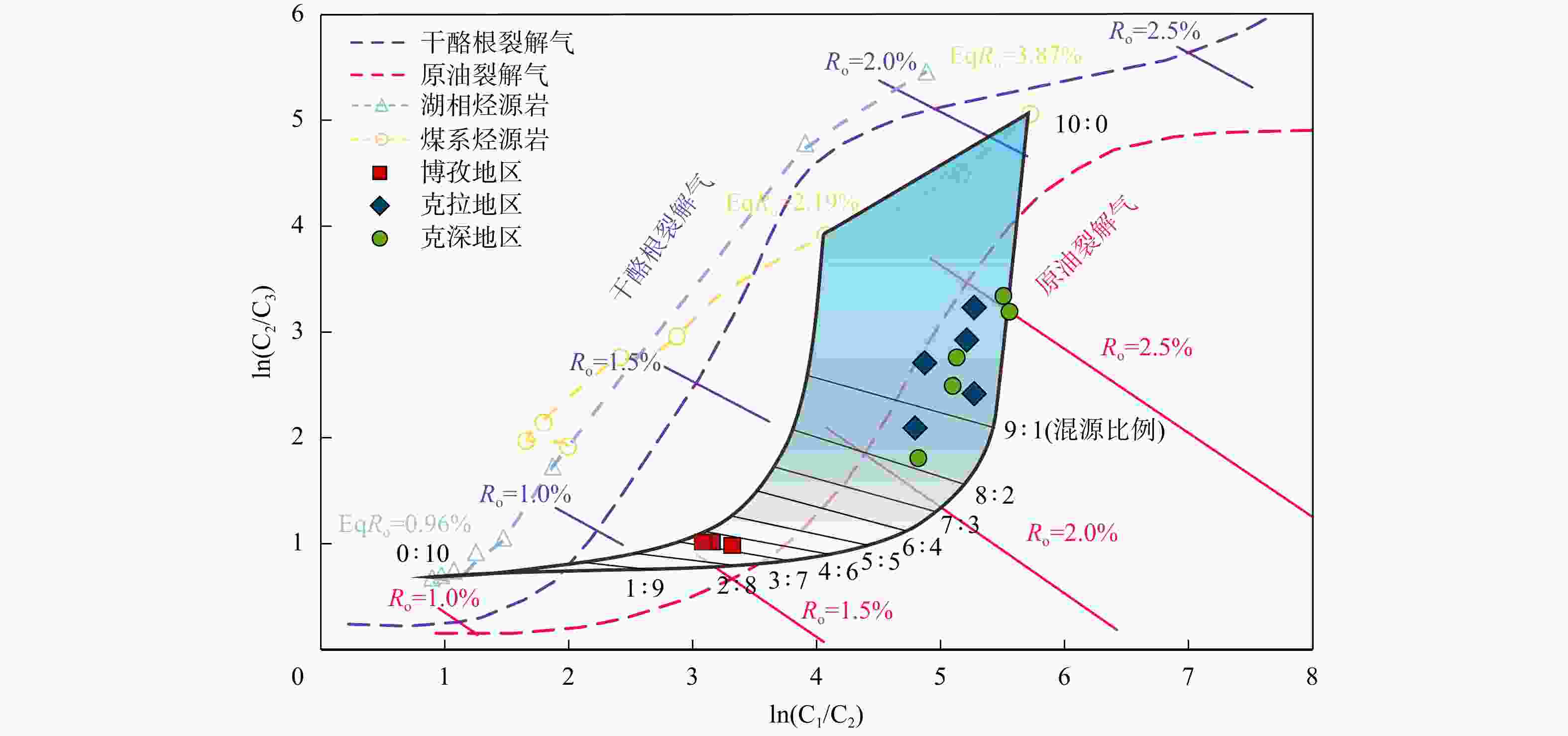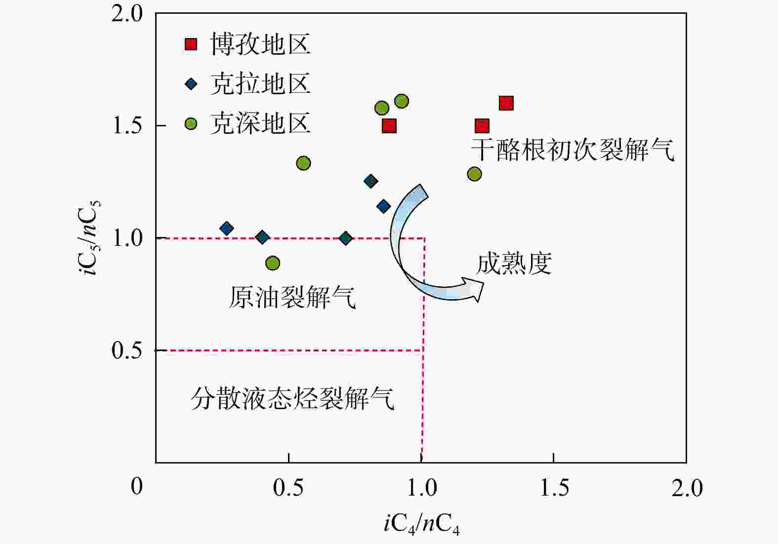 i C4/n C4>1.0且i C5/n C5>1.0)表明克拉苏地区天然气为干酪根裂解气;混源比例计算结果显示,克拉−克深地区天然气主要来源于成熟煤系烃源岩,其贡献比例普遍超过80%;而博孜地区天然气主要来源于湖相泥岩,煤系气贡献比例仅约30%。克拉苏地区天然气并非原油裂解气,而是不同类型干酪根在高−过成熟阶段的裂解产物,其在经典判识图版上呈现的“原油裂解气”特征系高演化程度所致。研究成果揭示了高演化条件下深层天然气成因判识的复杂性,建立了混源气定量解析方法,为库车坳陷及类似高演化盆地深层天然气勘探提供了理论依据。Abstract:Objective The Kelasu structural belt of the Kuqa Depression in the Tarim Basin hosts abundant deep to ultra-deep natural gas resources, and the reservoirs generally exhibit a high degree of thermal maturity. Natural gas from the Kela-Keshen area exhibits a characteristic "oil-cracking gas" signature on the conventional genetic diagram of ln(C2/C3) versus ln(C1/C2). However, this interpretation is inconsistent with the geological reality, as the area lacks effective Type Ⅰ-Ⅱ kerogen and oil sources, resulting in a discrepancy between the inferred gas origin and the actual geological conditions. To elucidate the apparent “oil-cracking gas” phenomenon and its genetic mechanism in this area, an in-depth investigation of the geochemical characteristics is required.