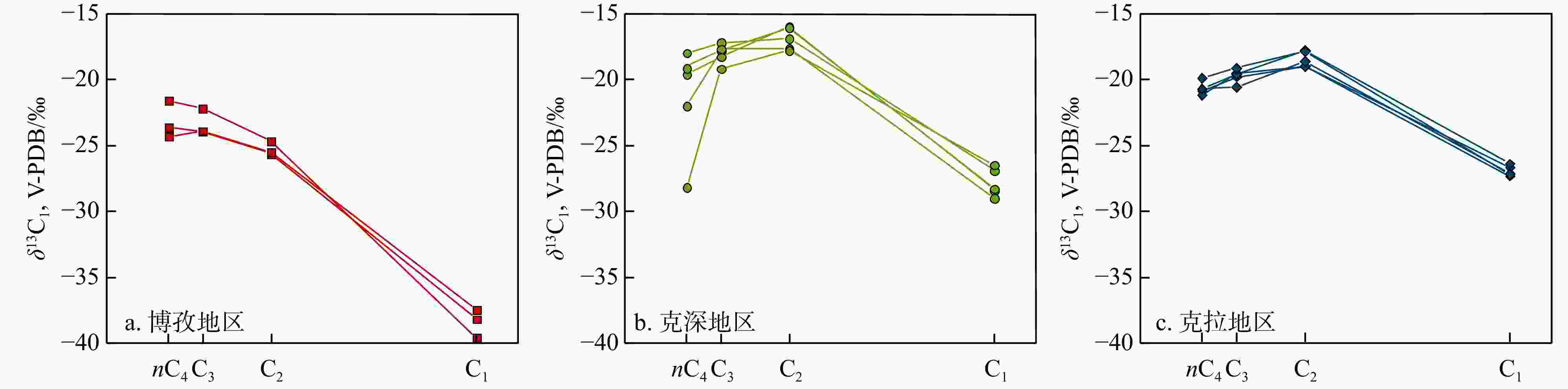 地区 井位 埋深/m 层位 气体组分$ \varphi_{\mathrm{B}} $/% 干燥系数/% CH4 C2H6 C3H8 iC4H10 nC4H10 iC5H12 nC5H12 N2 CO2 博孜地区 BZ9井 > 6000 K 86.20 3.65 1.300 0.290 0.330 0.090 0.060 1.74 0.48 93.80 BZ11井 7306 ~7336.5 K1bs 89.40 4.05 1.460 2.060 1.560 0.080 0.050 1.16 1.16 90.60 BZ12井 > 6000 K 88.06 3.16 1.150 2.360 1.920 0.030 0.020 1.03 0.69 91.13 克拉地区 KL2-1井 3548 ~3705 K 98.40 0.52 0.028 0.005 0.007 0.002 0.002 0.52 0.56 99.43 KL2-J2井 5039 ~5458.5 K 96.10 0.50 0.045 0.007 0.009 0.003 0.002 0.58 2.90 99.42 KL201井 3770 ~3795 K1bs 97.70 0.80 0.100 0.006 0.007 0.002 0.002 0.48 0.57 99.07 KL201井 4 016 ~4021 K1bs 96.88 0.75 0.050 0.012 0.045 0.027 0.026 1.29 0.17 99.09 KL204井 3925 ~3930 K1bs 98.29 0.50 0.020 0.002 0.005 0.001 0.001 0.56 0.64 99.47 克深地区 KS14井 7100 ~7115 K1bs 94.59 0.58 0.048 0.010 0.011 0.006 0.004 2.57 1.59 99.31 KS24井 6280 ~6483 K1bs 97.53 0.35 0.014 0.001 0.003 0.001 0.001 1.10 0.83 99.62 KS5井 > 4500 K1bs 97.12 0.37 0.014 0.001 0.001 0.001 0.001 1.63 0.55 99.60 KS6井 5605 ~5653 K1bs 98.00 0.59 0.037 0.005 0.009 0.004 0.003 0.70 0.68 99.35 KS13-5井 7402 ~7464 K1bs 94.85 0.76 0.1224 0.048 0.052 0.027 0.017 1.45 1.34 98.93 注:K. 白垩系;K1bs. 下白垩统巴什基奇克组;下同 表 2 库车坳陷克拉苏构造带不同地区天然气碳同位素分布特征