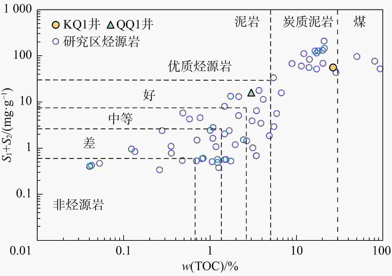 井号 地层 深度/m 岩性 w(TOC)/% S1/(mg HC·g−1) S2/(mg HC·g−1) HI/(mg·g−1) Tmax/℃ QQ1井 J2q 221.5 湖相泥岩 2.10 0.23 7.23 344 423.5 KQ1井 T3t 462.1 炭质泥岩 28.6 0.64 35.63 125 428.3 注:J2q. 侏罗系恰克马克组;T3t. 三叠系塔里奇克组;S1. 游离烃;S2. 热解烃;Tmax. 最大热解峰温;HI. 氢指数;下同 -