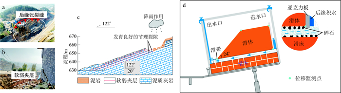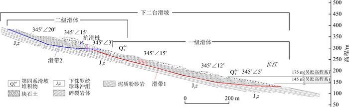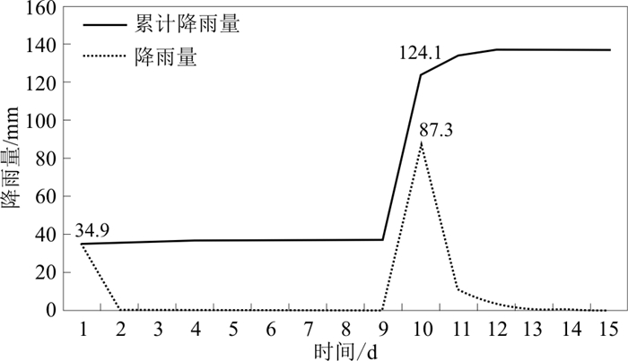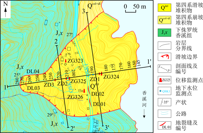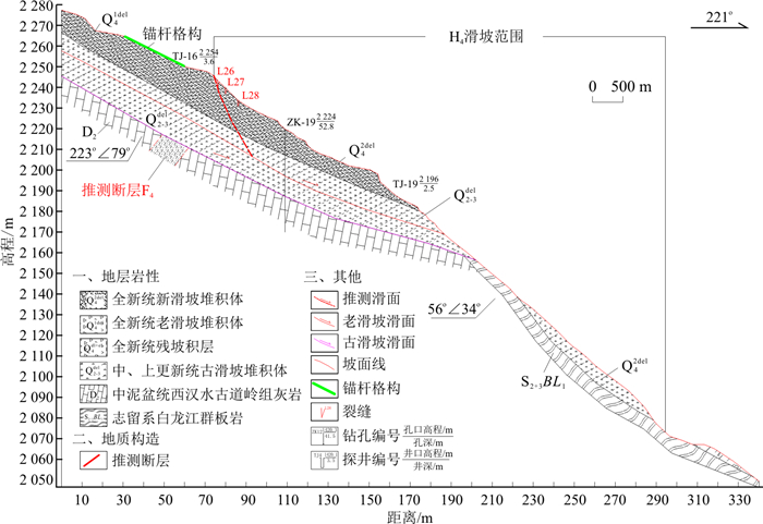 Rainfall infiltration and artificial excavation are important factors inducing the loess landslides. To study the deformation process of loess landslides in the Guanzhong area and its influence on stability under the two inducements, the Laomiao landslide in Yangchang Village, Changwu County, Shaanxi Province is taken as the research object.Through field investigation, geological mapping and borehole exploration, the deformation characteristics of the landslide are determined, and the deformation evolution process of the landslide is qualitatively analyzed. Based on the measured daily rainfall within 15 days before the landslide deformation, the process of landslide formation under continuous rainfall after excavation actions at the slope foot was simulated by using finite element software. Based on the strength reduction method, the stability variation law of the landslide is studied. The results show that: ① the special formation structure in the Guanzhong area is the internal cause of landslide deformation, and rainfall is the most important inducing factor; ②the deformation evolution process of the landslide: at first the slope was in a state of creep. After the excavation actions, the anterior edge of the slope became unstable, and then the trailing edge of the slope was drawn downward, resulting in tension cracks. Under the influence of rainfall, rainfall infiltrated along the fissures of the slope, while the shear strength of the rock and soil mass in the central part was reduced, resulting in the sliding interface between the soil layer and red clay layer. Ultimately a deep landslide was induced. ③ After the landslide excavation, the stability coefficient decreased by 0.102, as compared with the initial state. Then, influenced by continuous rainfall, the stability coefficient decreased slowly at an average rate of 0.010/d in the first 10 d, and rapidly decreased to the lowest rate of 0.034/d in 10-13 d, and began to rise after 13 d. The research results are expected to provide effective basis for the prevention and control of such landslides.