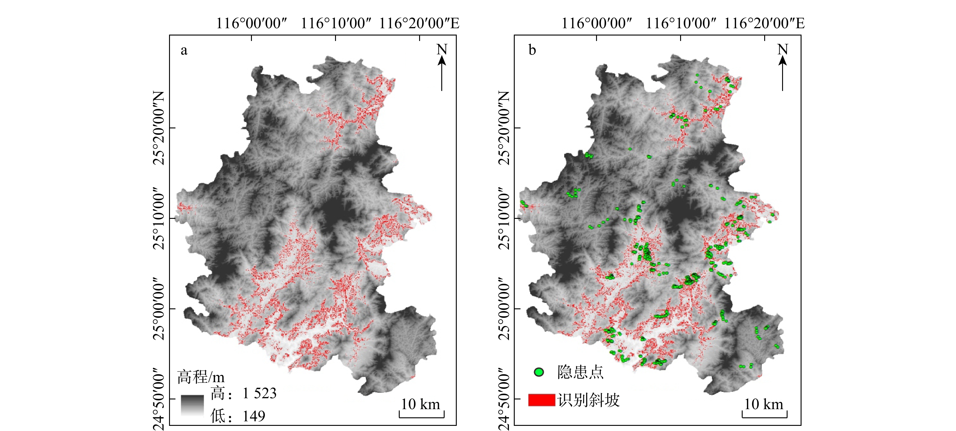 ResultsThe results indicate that: ①The multi-feature combination model achieves higher accuracy in landslide recognition compared to single-feature models; ②The rapid recognition model incorporating slope, elevation, plane curvature, profile curvature, and R, G, and B bands accurately identifies existing landslides, with both Accuracy and Recall exceeding 0.99; ③Even after removing the visual layer, the model maintains an Accuracy and Recall of 0.86 for early landslide recognition in high vegetation coverage area. When extended to the entire Wuping County, Accuracy reached 0.80, demonstrating high recognition performance; ④The model achieves and F1score of 0.86, and when generalized to the entire county, the F1score remains as high as 0.84, indicating strong generalization capability and reliable performance in automatically recognizing landslide hazards in similar geological environments.
