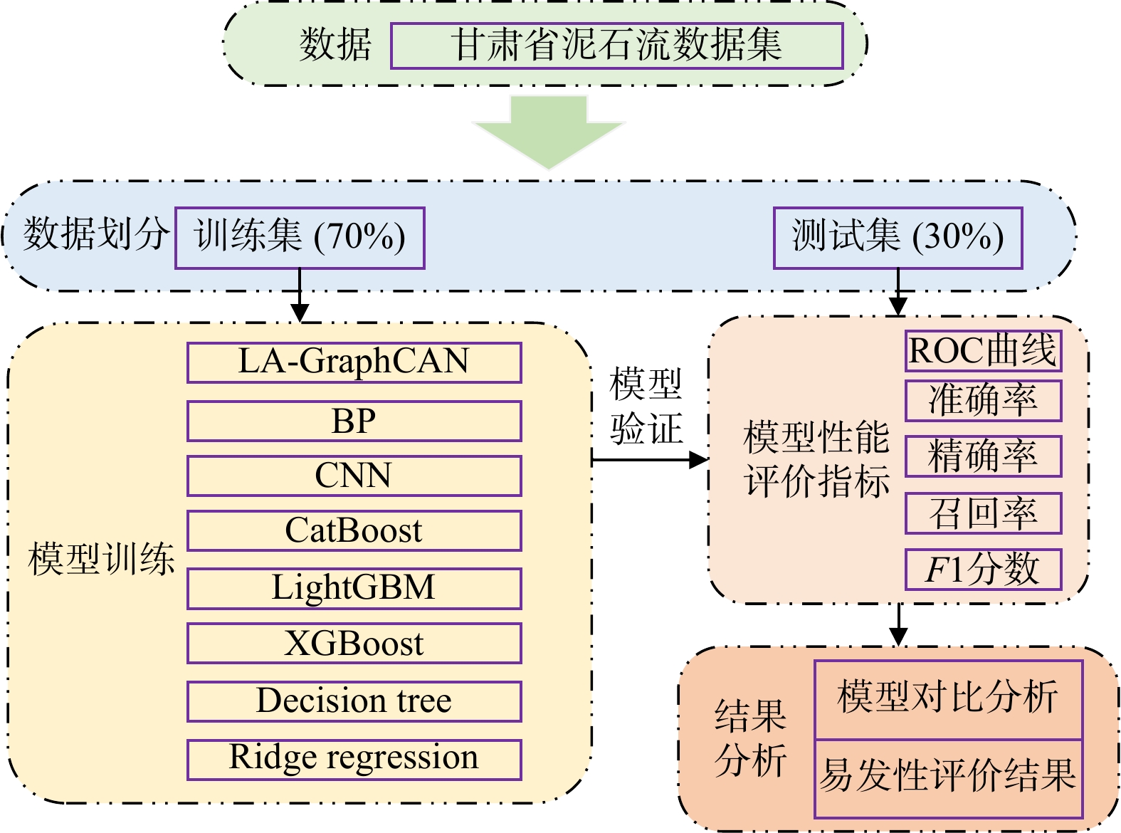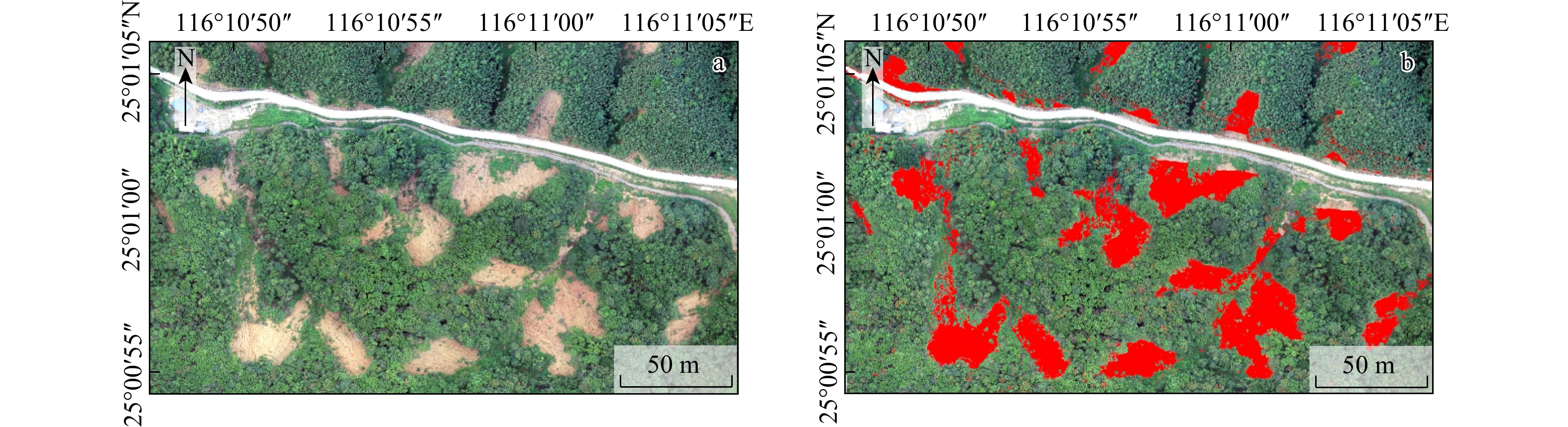 Methodsthis study developed an automatic recognition model for shallow landslides using a machine learning approach, the LightGBM decision tree algorithm. The model targets clustered shallow landslides developed in highly weathered granite layers induced by heavy rainfall in high vegetation coverage area. High-resolution aerial images and DOM data from Wuping County, Fujian Province, were used, with feature parameters including slope, elevation, plane curvature (SOA), profile curvature (SOS), and R, G, and B bands selected to construct, train and test the recognition model.