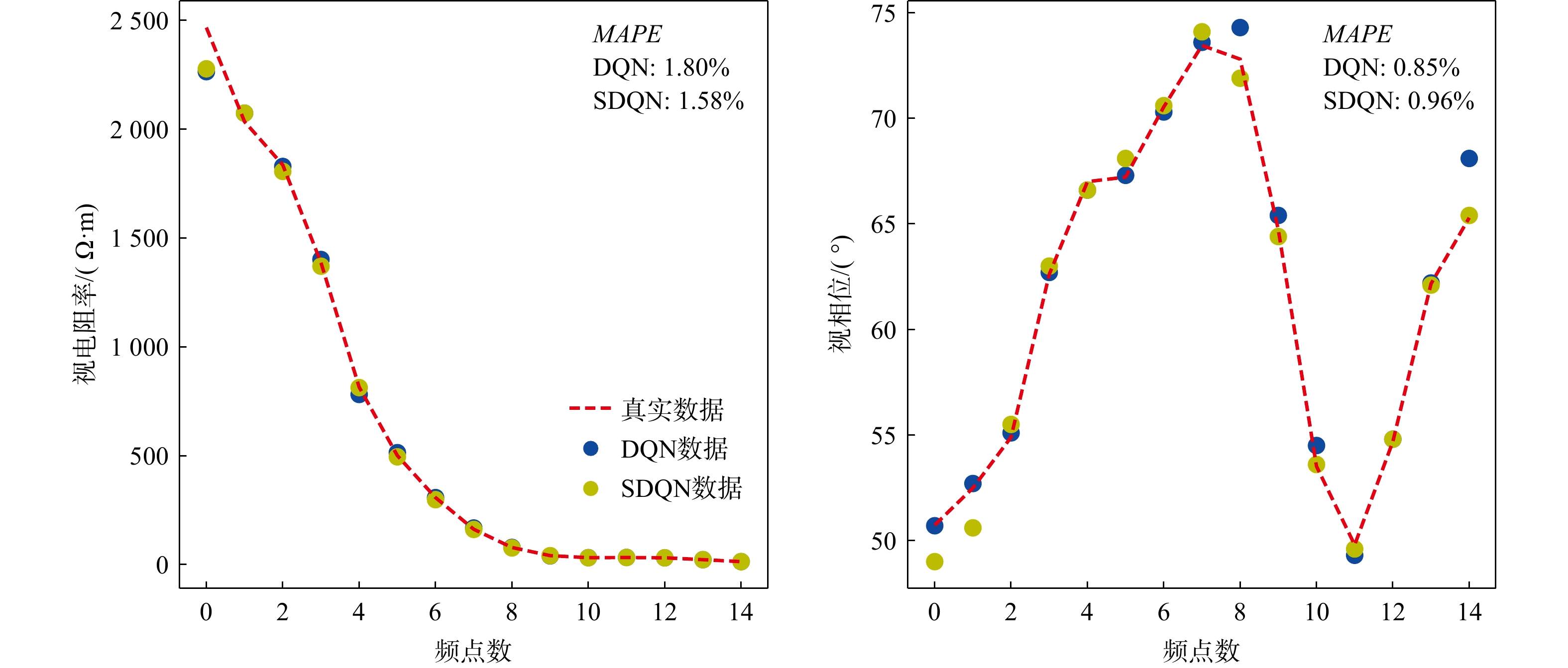 The experimental results of the theoretical model inversion show that, compared with the DQN inversion and Occam inversion methods, the results of the proposed method are more stable when the observed data are inverted with the same number of iterations and different noise levels. The inversion results of the magnetotelluric measured data in the Tashi Kang Mine area of Tibet are