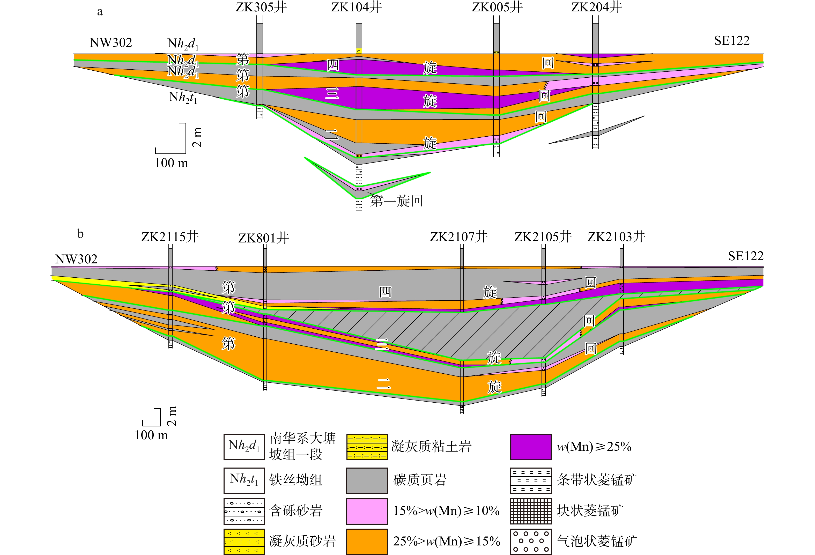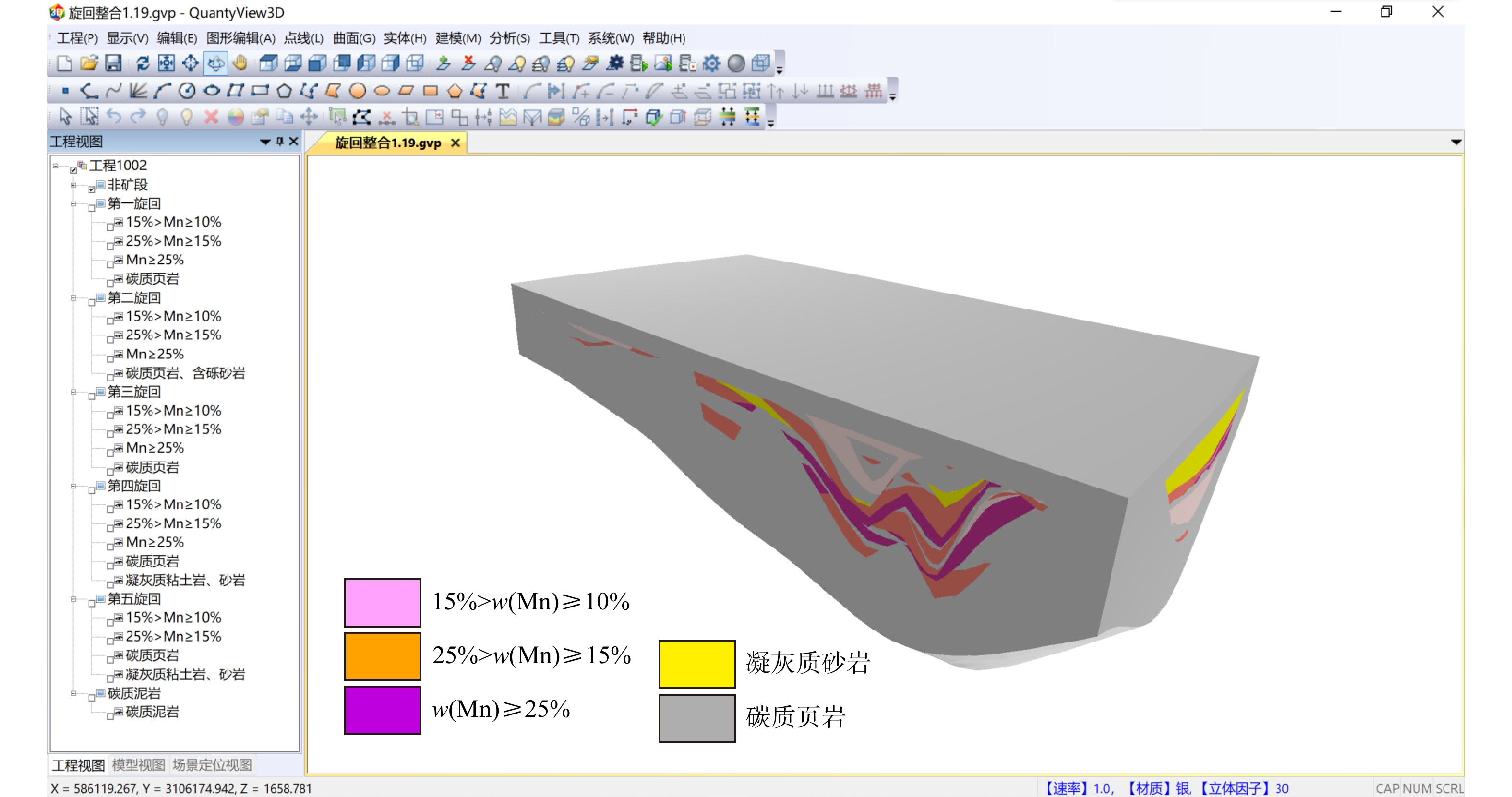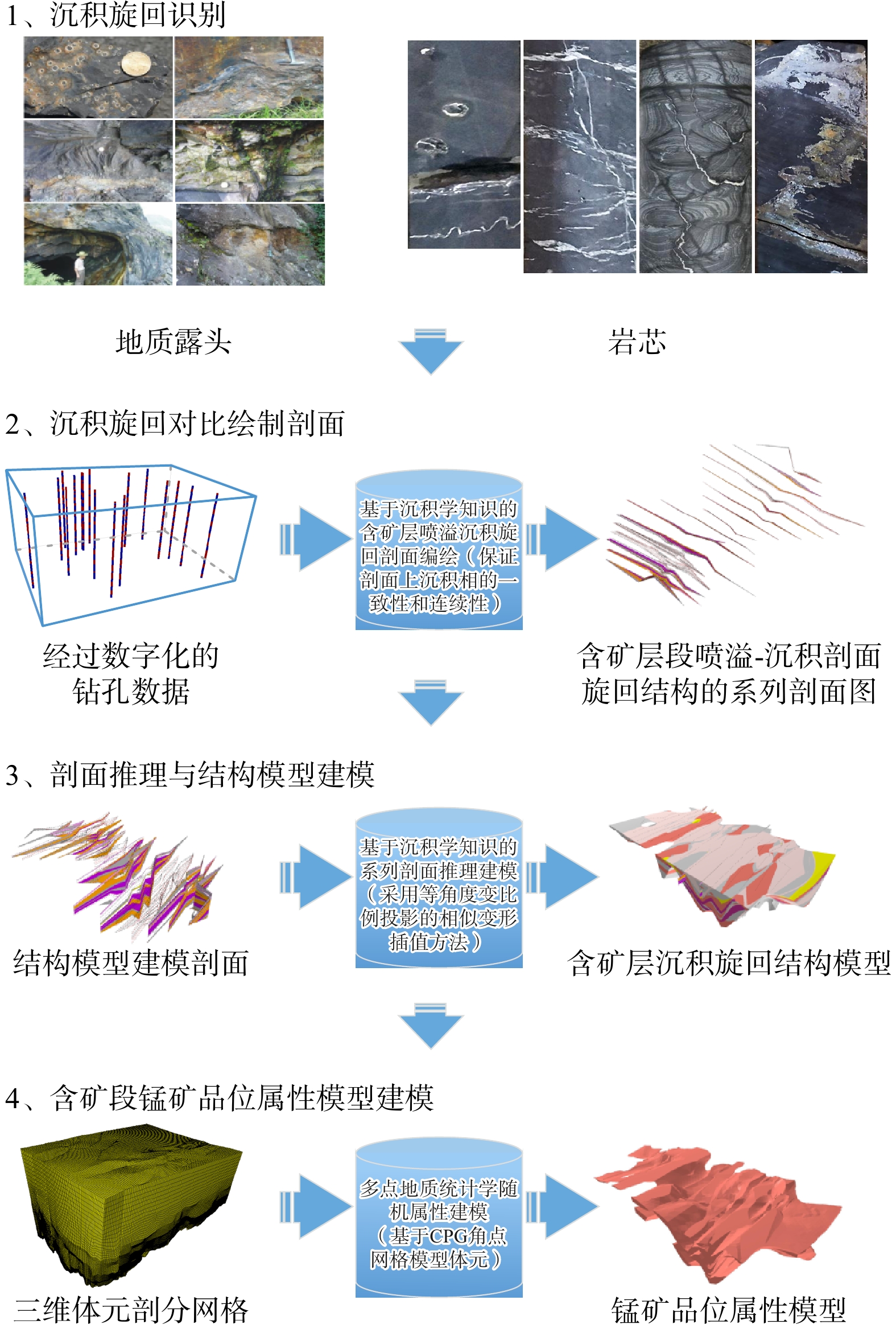 First, the drill cores (ore cores) in the ore-bearing segment of each exploration line of the deposit were divided and correlated for sedimentary cycles, and a series of profile maps of manganese-bearing fluid exhalative-sedimentary cycles were compiled. On this basis, a 3D structural model of sedimentary cycles was constructed by adopting the method combining sedimentology knowledge-driven serial profile topological reasoning and layer surface modeling. Meanwhile, combined with the Triangulated Irregular Network-Corner Point Grid (TIN-CPG) hybrid data model, a 3D attribute model of manganese content was established by using the multi-point geostatistical random attribute modeling method based on Corner Point Grid (CPG), and finally an integrated 3D geological model with coupled structure and attribute was formed.