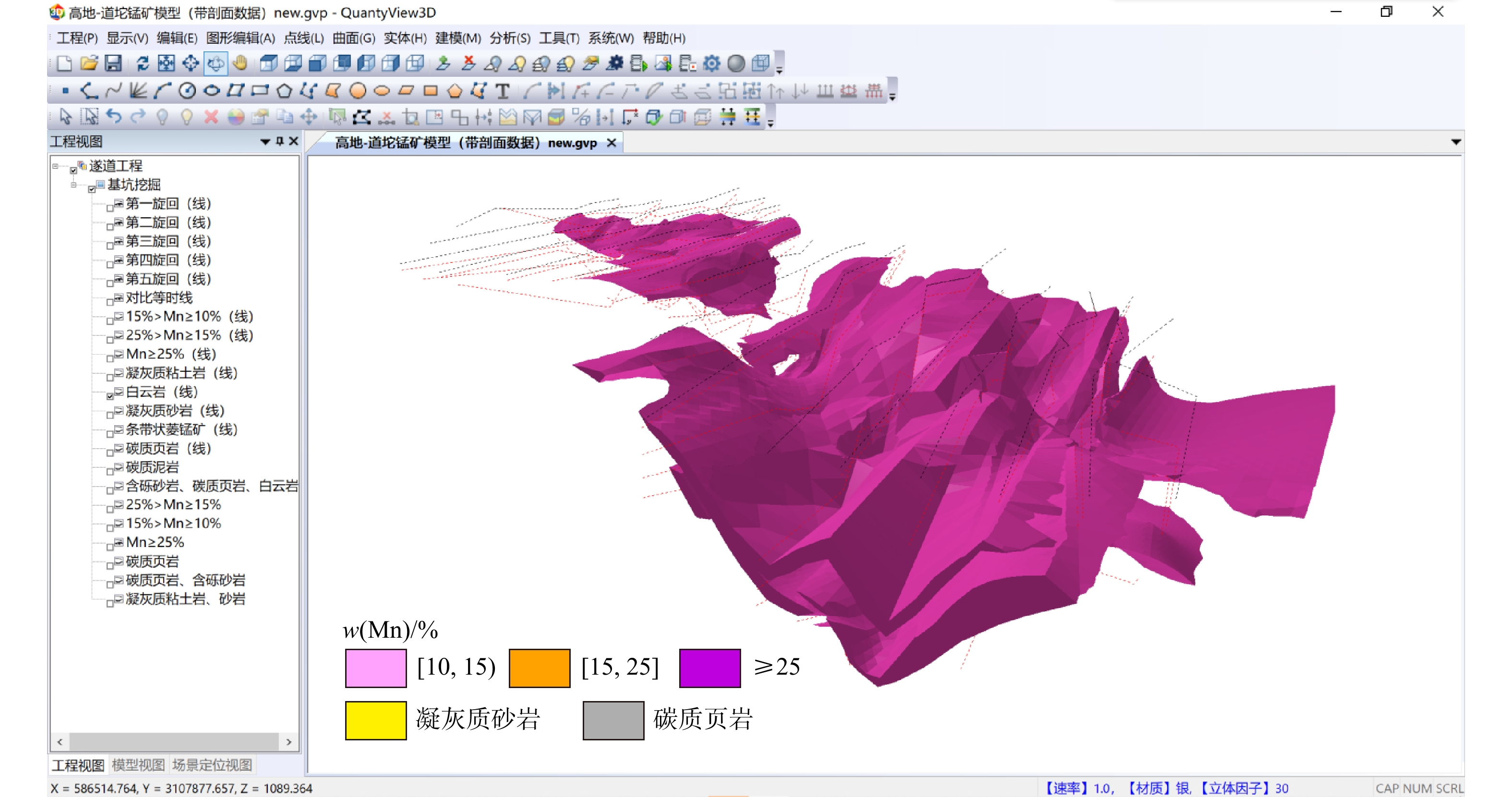 The research results not only provide intuitive visual evidence for the new metallogenic model of Datangpo-type manganese deposit, but also reveal the unique exhalative-sedimentary metallogenic environment, spatial characteristics and ore-forming process of this super-large manganese deposit from the 3D visualization perspective, which is helpful for understanding the ore-forming mechanism, occurrence and distribution characteristics of the deposit, and provides a structural-attribute integrated 3D geological model for the subsequent deep and peripheral metallogenic prediction of such deposits.