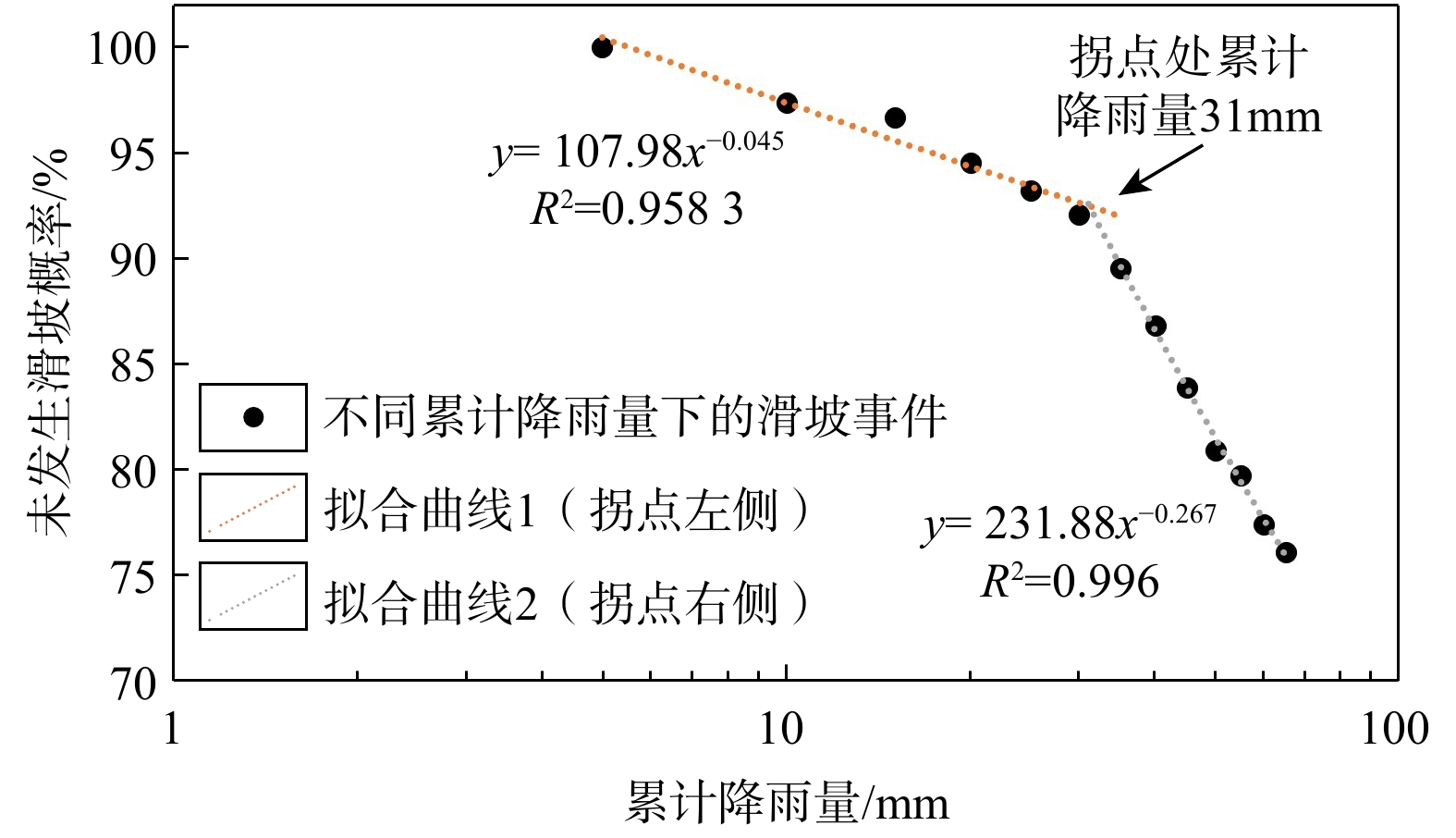 The results indicate: ① Landslides in the region are primarily small to medium-sized shallow-deposited layer landslides, with a significant positive correlation between rainfall and landslides occurrences, with 86.63% of landslides occurring during the rainy season; ②The nonlinear fitting equation for the continuous probability threshold is $ 1/P=1+{{\mathrm{e}}}^{2.0792+0.24156\times D-0.04072\times E} $, with a fitting degree of
